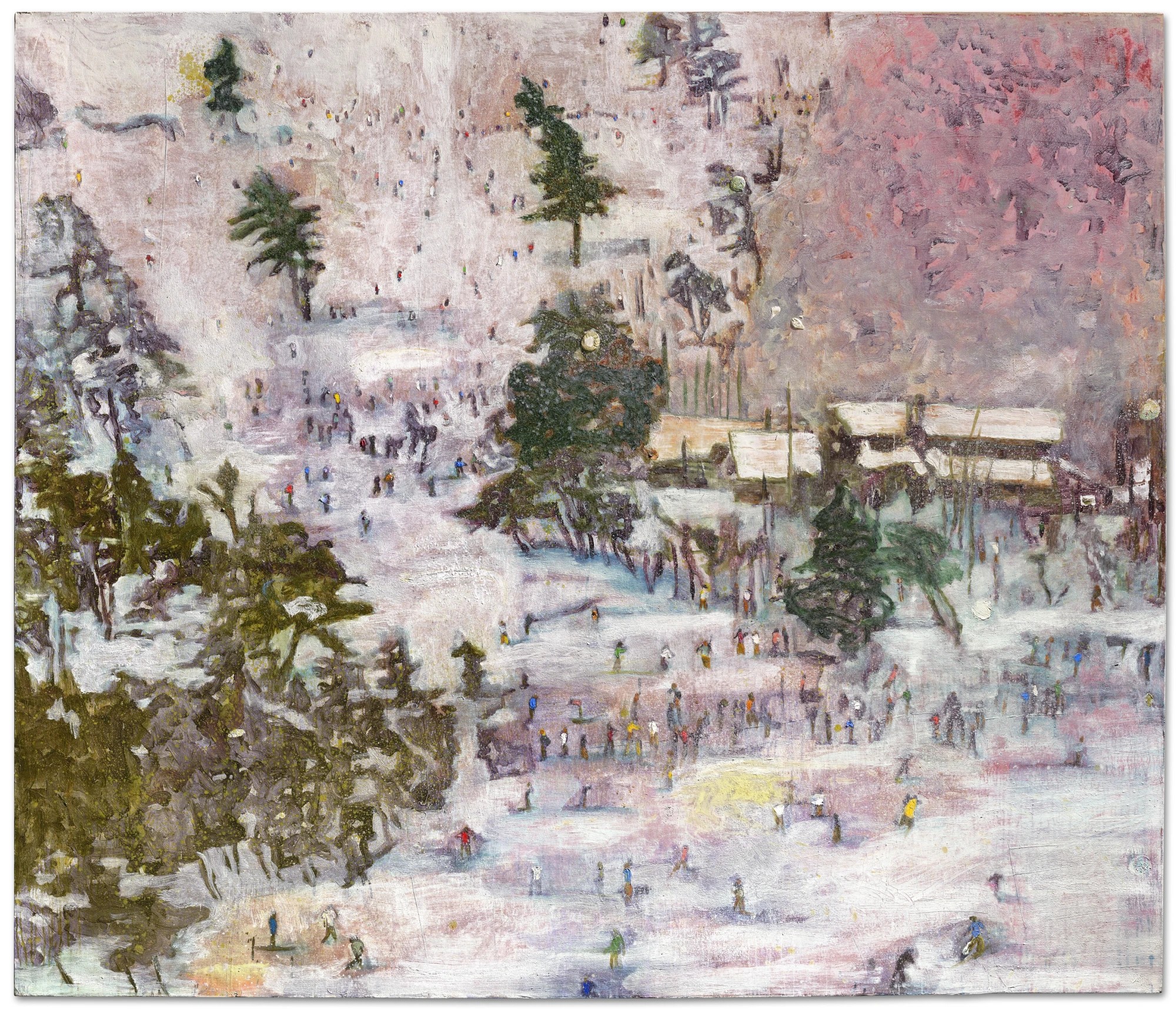 Peter Doig’s Ski Jacket (1994) led Christie’s 20th/21st century London evening sale on October 15th, selling for £14.27 million ($19.13 million), well above its £8 million ($10.72 million) high estimate. the work depicts a ski slope flushed in glowing, auroral hues of pink, gold and blue. Tiny skiers are peppered among conifers and chalet buildings, bringing together the cabins and trees that are among Doig’s most iconic motifs.