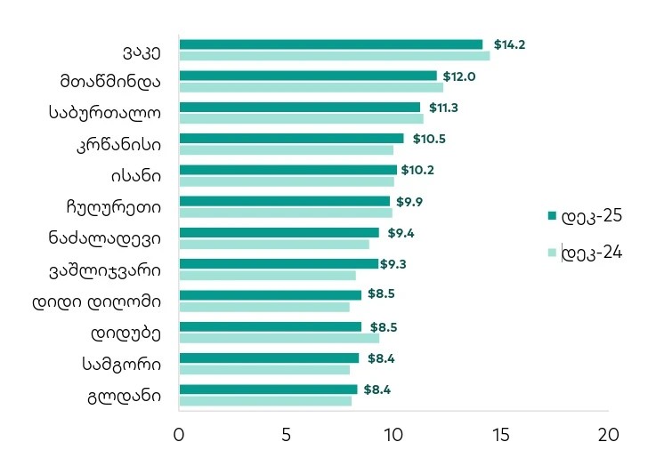 2025 წელს, ქირის ფასი მ²-ზე $9-10 დოლარის ფარგლებში შენარჩუნდა, რაც 2024 წლის შემდეგ სტაბილურობის ახალი დიაპაზონია.