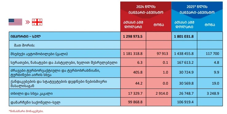 საგულისხმოა, რომ აშშ-სთან სავაჭრო ბრუნვის უდიდესი წილი იმპორტია, რაშიც მსუბუქი ავტომობილები თამაშობს მნიშვნელოვან როლს.