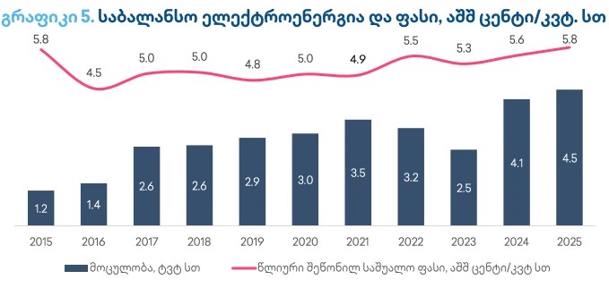 TBC Capital-ის მიერ მომზადებული მიმოხილვის მიხედვით, საბალანსო ელექტროენერგიის წლიური საშუალო ფასი 2023 წლის შემდეგ ზრდას განაგრძობს და 2025 წელს ერთ კვტ.სთ-ზე 5.83 ცენტამდე გაიზარდა.