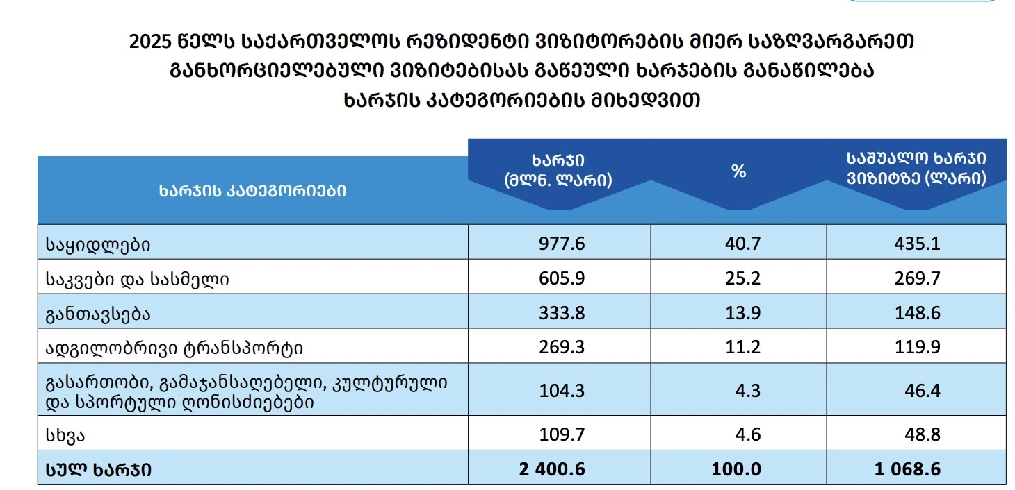 საქსტატის ინფორმაციით, 2025 წელს საქართველოს რეზიდენტმა ვიზიტორებმა საზღვარგარეთ 2.4 მილიარდი ლარი დახარჯეს, ვიზიტზე საშუალო ხარჯი 2024 წელთან შედარებით 6%-ით გაიზარდა და 1068.6 ლარი შეადგინა.
