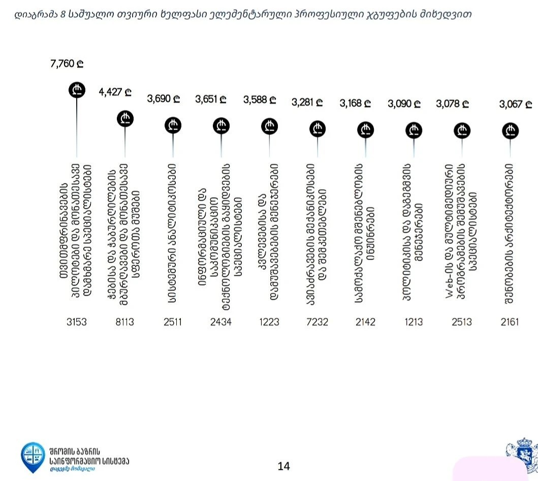 კვლევა ყველაზე მაღალანაზღაურებადი პროფესიული ჯგუფების ათეულზეც გვიქმნის წარმოდგენას – მენეჯერებში - კვლევებისა და დამუშავებების მენეჯერები; სპეციალისტებში - სისტემური ანალიტიკოსები; ტექნიკოსებში - თვითმფრინავების პილოტები; ოფისის პერსონალში - სოციოლოგიური გამოკვლევების და ბაზრის კონიუნქტურის კვლევების ინტერვიუერები; მომსახურების სფეროსა და სავაჭრო დაწესებულებების მომსახურე პერსონალში - ბორტგამცილებლები და სტიუარდები; სოფლის მეურნეობის კვალიფიციურ მუშაკებში - ღრმა წყლების მეთევზეობის სფეროს მუშაკები; ხელოსნებსა და მონათესავე პროფესიების მუშაკებში - ავიაძრავების მექანიკოსები და შემკეთებლები; სამრეწველო დანადგარებისა და მანქანების ოპერატორებსა და ამწყობებში - ჭებისა და ჭაბურღილების მბურღავები და მონათესავე სფეროთა მუშები; დამწყები კვალიფიკაციის მქონე მუშახელში - სამოქალაქო მშენებლობის არაკვალიფიციური მუშები. ზოგადად, ყველაზე მაღალი საშუალო თვიური ხელფასი, ელემენტარული პროფესიული ჯგუფების მიხედვით, თვითმფრინავების პილოტებს აქვთ – 7, 760 ლარი.